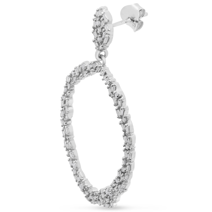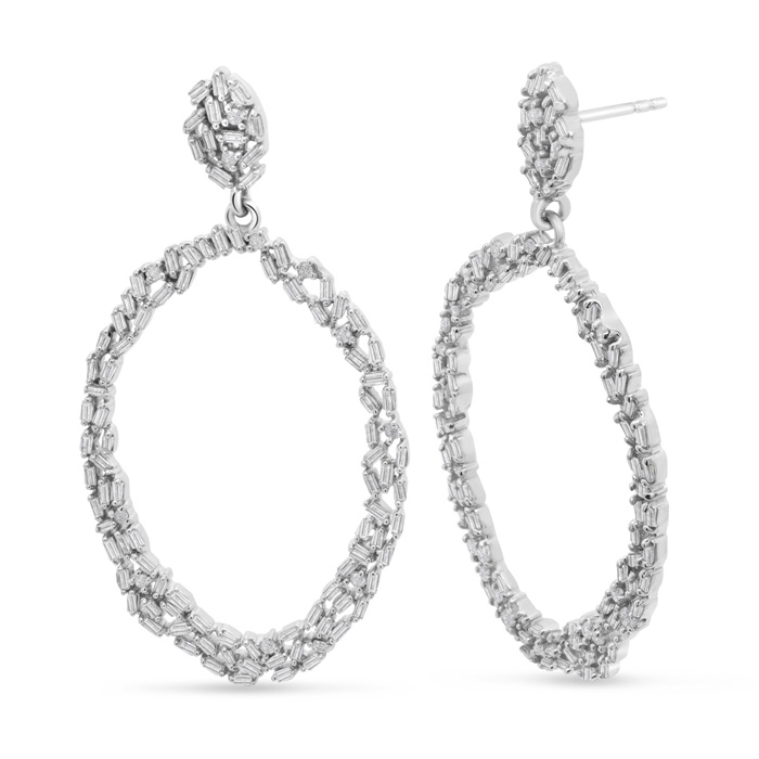These fabulous diamond earrings feature 216 sparkling baguette shape and round shape diamonds in I-J color, I2-I3 clarity totaling approximately 2 carats. These earrings are in sterling silver and have comfortable and secure post with friction backs. These earrings dangle down approximately 2 inches.