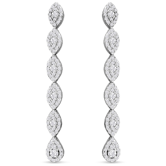These diamond drop earrings feature 180 diamonds in I-J color, I1-I2 clarity. Total carat weight is 2 carats. These earrings are in 14 karat white gold. These earrings dangle down 2 inches and have post with friction backs.