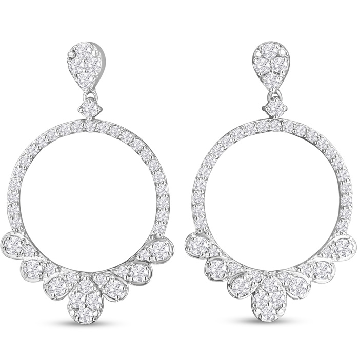 These diamond drop earrings feature 86 diamonds in I-J color, I1-I2 clarity. Total carat weight is 2 carats. These earrings are in 14 karat white gold. These earrings dangle down 1 1/2 inches and have post with friction backs.