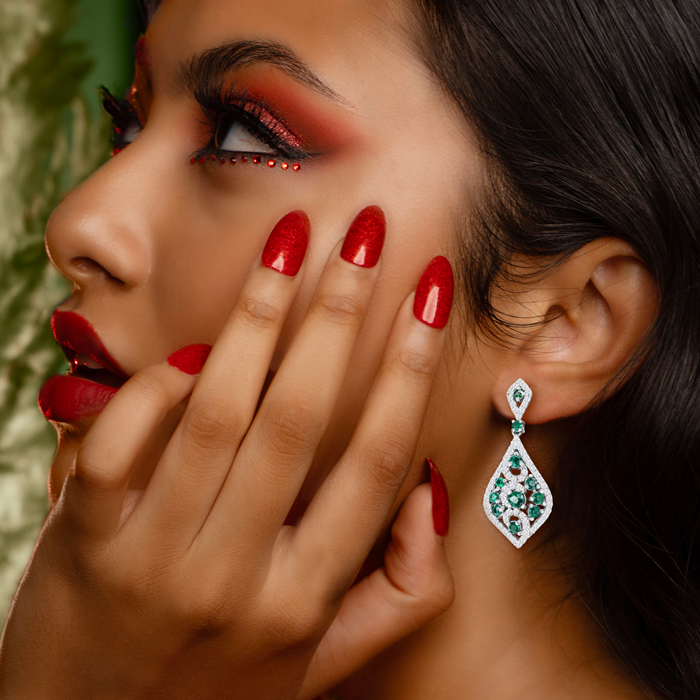 These gemstone and diamond drop earrings feature 22 emerald gemstones and 130 diamonds in I-J color, I1-I2 clarity. Total carat weight is 2 carats. These earrings are in 14 karat white gold. These earrings dangle down 1 1/4 inches and have post with friction backs.