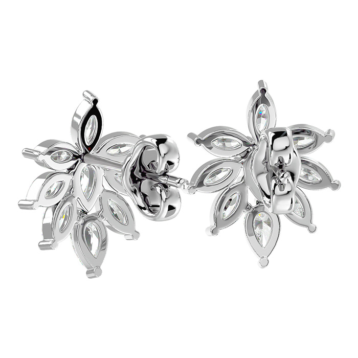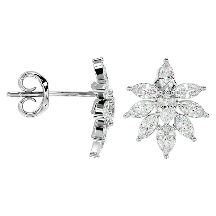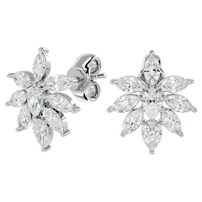 These elegant diamond earrings feature 4 pear shape diamonds and 14 marquise shape diamonds in F-G color, SI1-SI2 clarity. Total carat weight is approximately 2 carats. These earrings are in 14 karat white gold and have comfortable and secure friction backs.
