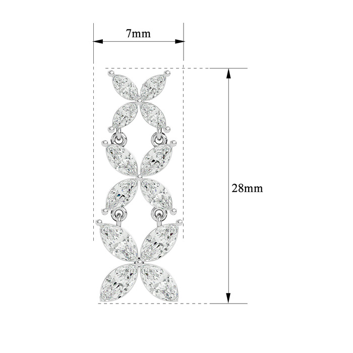These classic diamond earrings feature 8-4x2mm, 8-5x2.5mm and 8-6x3mm marquise shape diamonds in H-I color, SI2-I1 clarity. Total carat weight is approximately 3 3/4 carats. These earrings are in 14 karat white gold and have comfortable and secure post with friction backs and dangle down just over 1 inch.