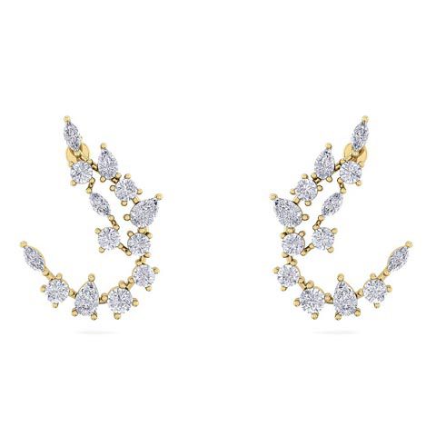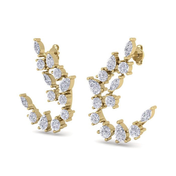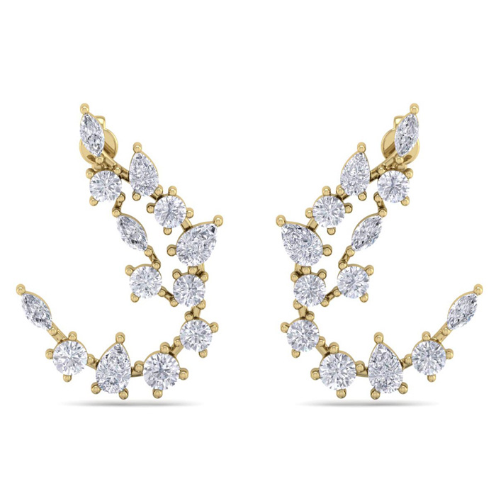 These elegant diamond earrings feature 14 round diamonds, 6 pear shape diamonds and 6 marquise shape diamonds in F-G color, SI1-SI2 clarity. Total carat weight is approximately 3 carats. These earrings are in 14 karat yellow gold and have comfortable and secure friction backs. Earrings dangle down 1 inch.