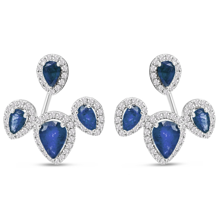 These gemstone and diamond drop earrings feature 8 sapphire gemstones and 114 diamonds in I-J color, I1-I2 clarity. Total carat weight is 3 carats. These earrings are in 14 karat white gold. These earrings dangle down 1/2 inch and have post with friction backs.