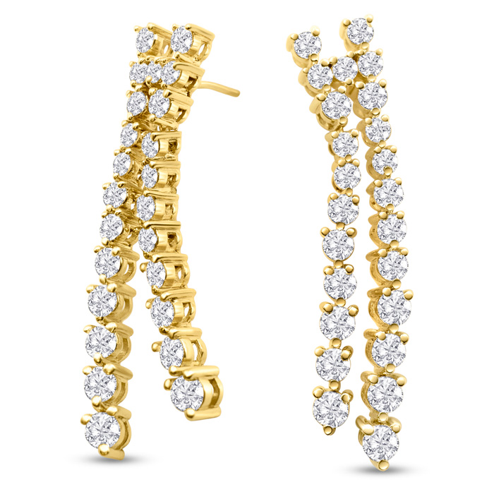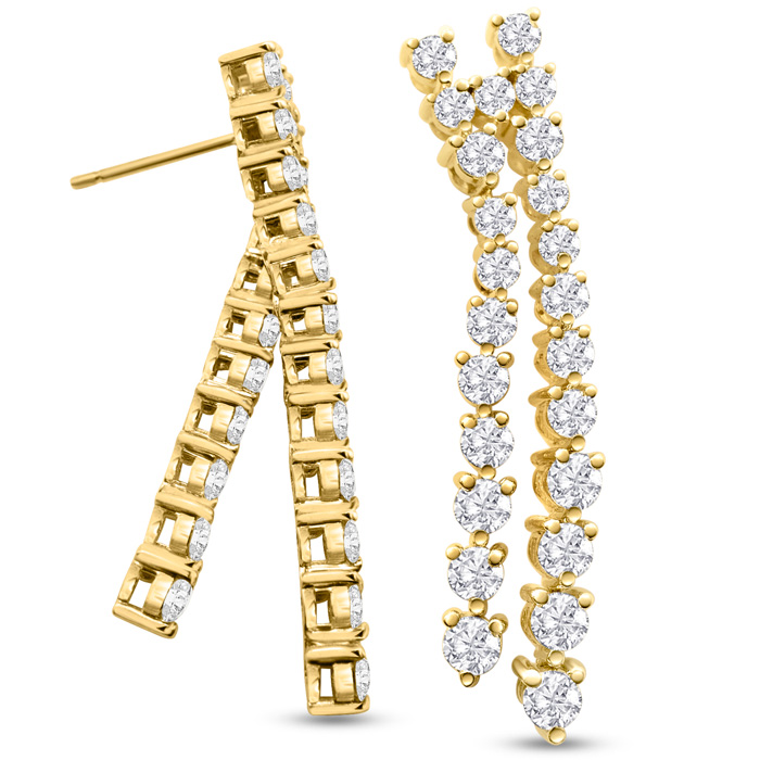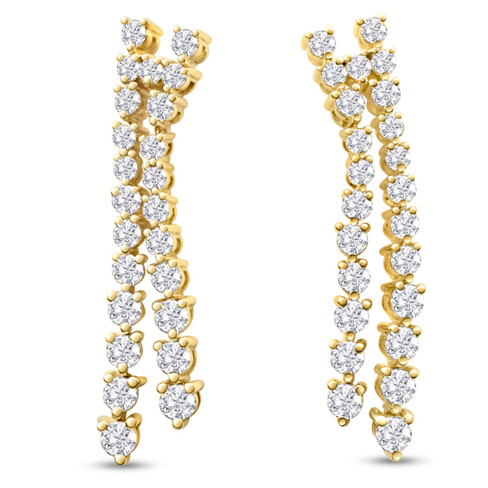 These diamond drop earrings feature 52 diamonds in I-J color, I1-I2 clarity. Total carat weight is 4 carats. These earrings are in 14 karat yellow gold. These earrings dangle down 1 1/2 inches and have post with friction backs.
