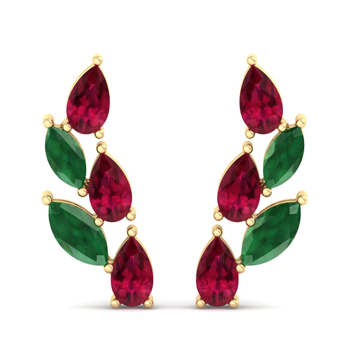 These ear climbers feature 10 pear and marquise shape emerald and ruby gemstones. Total carat weight is 2 1/4 carats. These earrings are in 14 karat yellow gold. These earrings lay up the ear just under 3/4 inch and have post with friction backs.