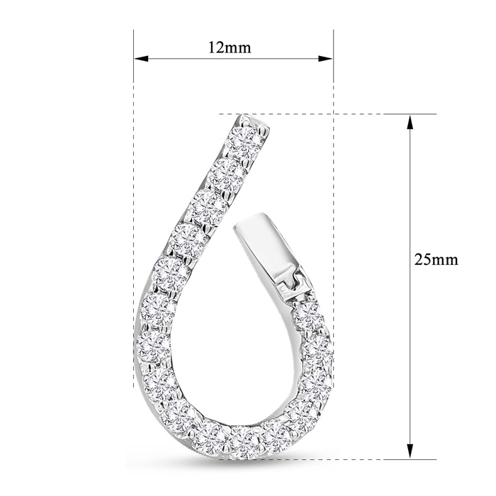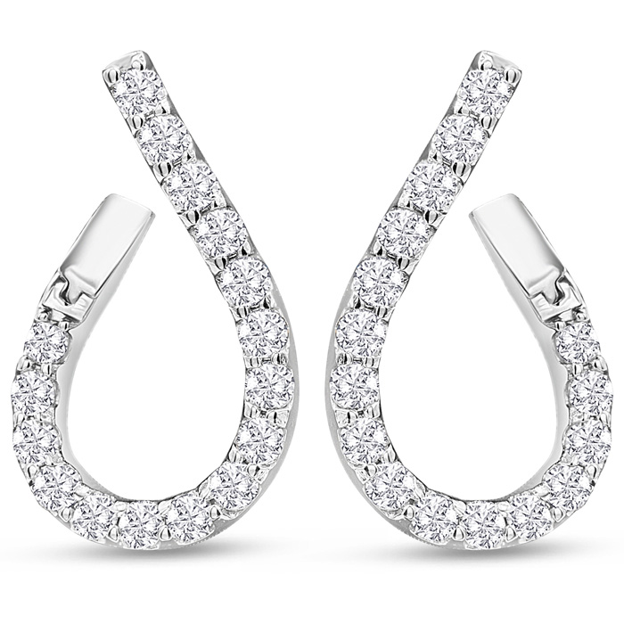 These diamond hoop earrings feature 32 diamonds in I-J color, I1-I2 clarity. Total carat weight is 1 1/3 carats. These earrings are in 14 karat white gold. These earrings dangle down 1 inch and have snap posts.