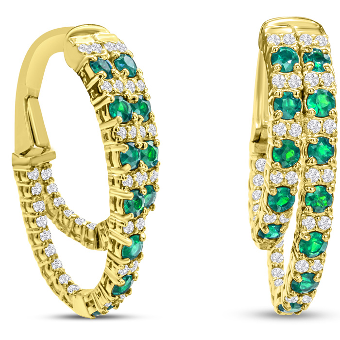 These gemstone and diamond hoop earrings feature 24 emerald gemstones and 82 diamonds in I-J color, I1-I2 clarity. Total carat weight is 2 1/2 carats. These earrings are in 14 karat Yellow gold. These earrings dangle down 1 inch and have omega backs.