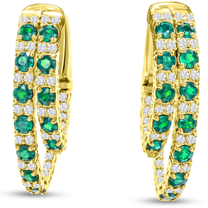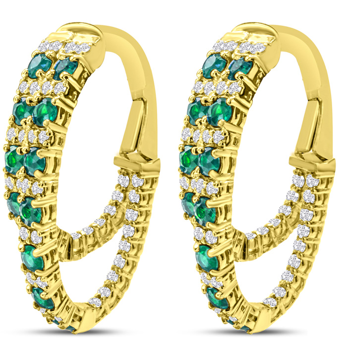 2 1/2 Carat Emerald and Diamond Hoop Earrings In 14 Karat Yellow Gold, 1 Inch