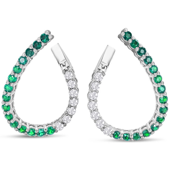 2 1/2 Carat Front-Back Emerald and Diamond Hoop Earrings In 14 Karat White Gold, 1 Inch