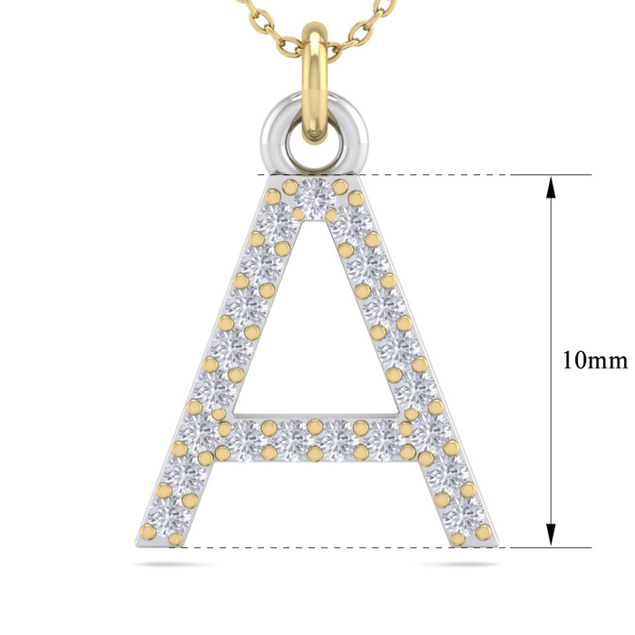 This classic A initial necklace features 21 diamonds in H-I color, I1-I2 clarity. Total carat weight is approximately 1/10 carat. The pendant measures just under 1/2 inch. This necklace is in 14 karat yellow gold and comes with an 18 inch cable chain with a spring ring clasp.