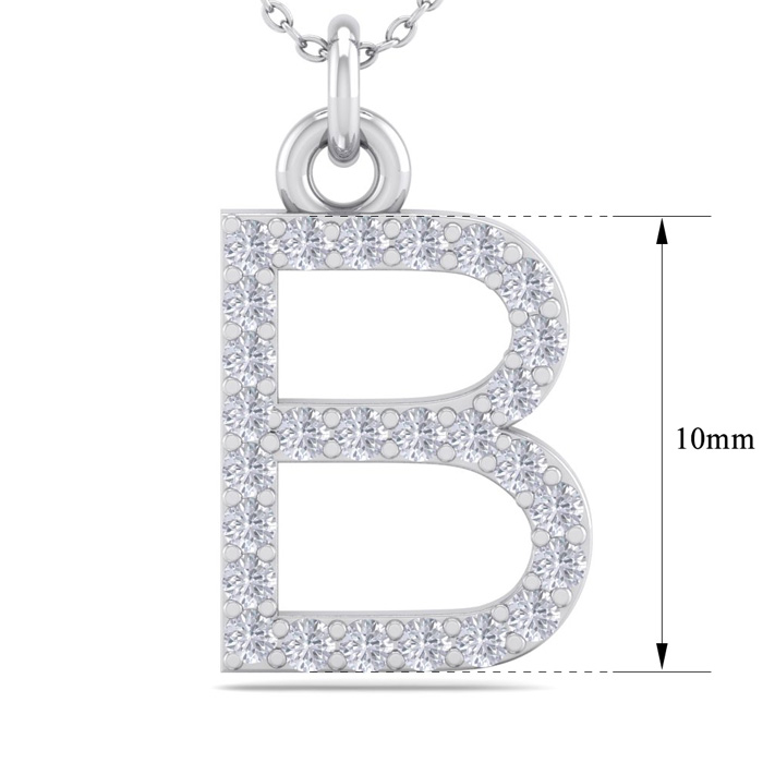 This classic B initial necklace features 27 diamonds in H-I color, I1-I2 clarity. Total carat weight is approximately 1/10 carat. The pendant measures just under 1/2 inch. This necklace is in 14 karat white gold and comes with an 18 inch cable chain with a spring ring clasp.
