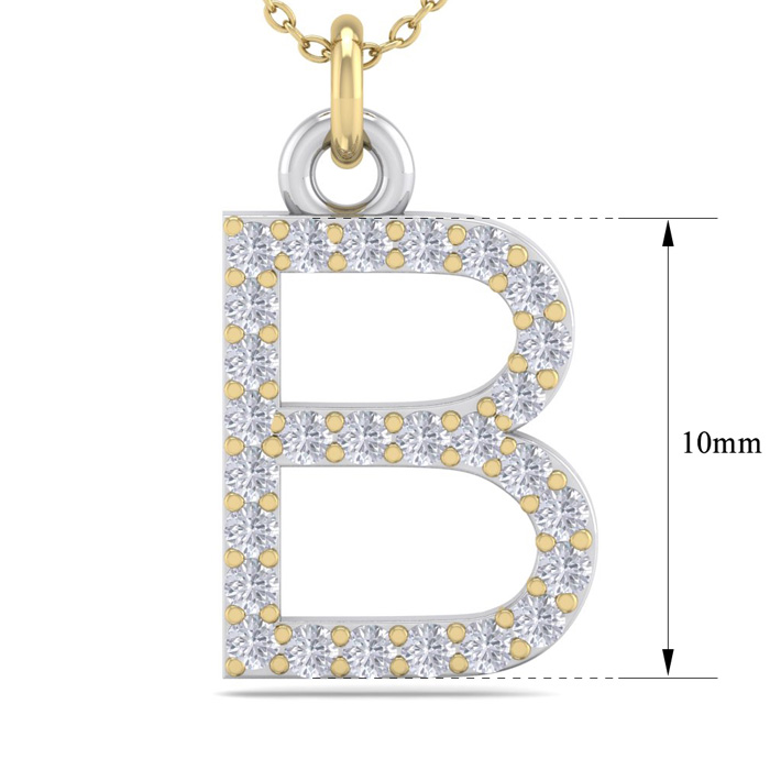 This classic B initial necklace features 27 diamonds in H-I color, I1-I2 clarity. Total carat weight is approximately 1/10 carat. The pendant measures just under 1/2 inch. This necklace is in 14 karat yellow gold and comes with an 18 inch cable chain with a spring ring clasp.