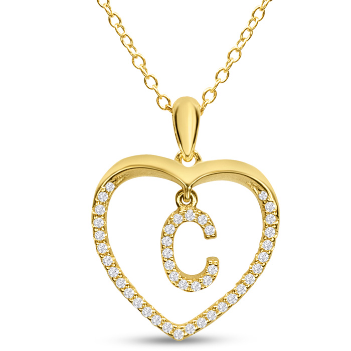 This amazing diamond initial necklace features approximately 36-50 sparkling diamonds in I-J color, I1-I2 clarity. Total diamond weight is approximately 1/5 carat. This diamond initial necklace is in yellow gold over sterling silver and comes with an 16 inch cable chain with a one inch extender and a spring-ring clasp. This pendant is 1/2 inch in diameter.