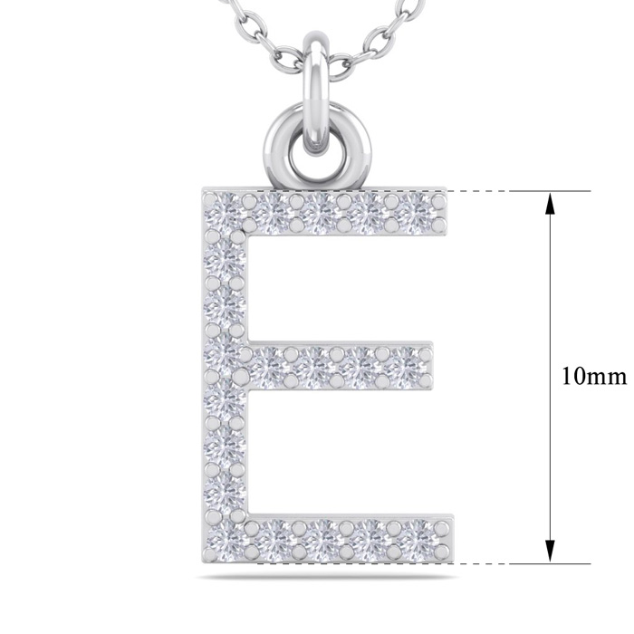 This classic E initial necklace features 20 diamonds in H-I color, I1-I2 clarity. Total carat weight is approximately 1/10 carat. The pendant measures just under 1/2 inch. This necklace is in 14 karat white gold and comes with an 18 inch cable chain with a spring ring clasp.