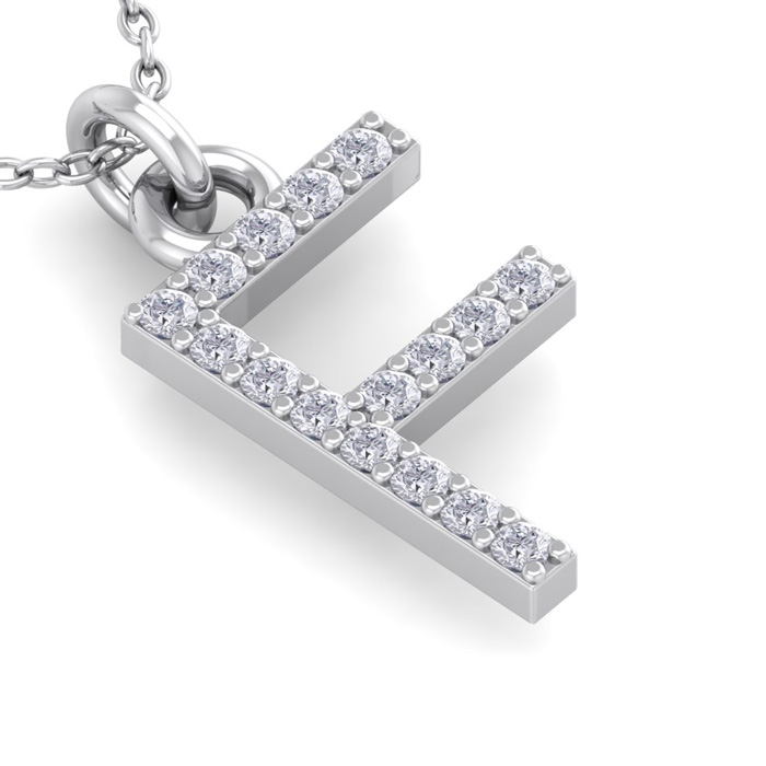 This classic F initial necklace features 16 diamonds in H-I color, I1-I2 clarity. Total carat weight is approximately 1/10 carat. The pendant measures just under 1/2 inch. This necklace is in 14 karat white gold and comes with an 18 inch cable chain with a spring ring clasp.