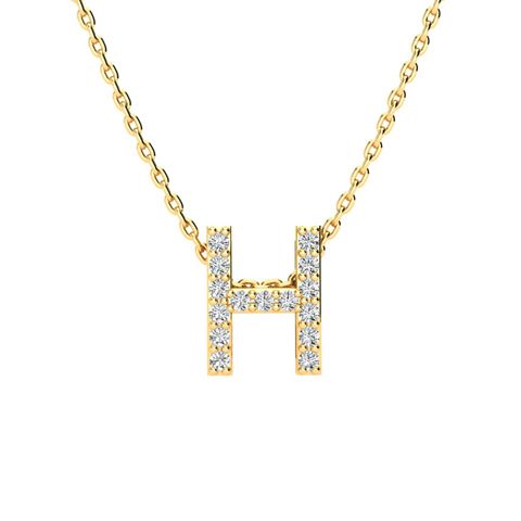H Initial Necklace In 14K Yellow Gold With 15 Diamonds. The most popular block initial style, suspended from and 18 inch Yellow gold cable-rope chain with spring ring clasp. Fiery H-I color, I1-I2 diamonds.