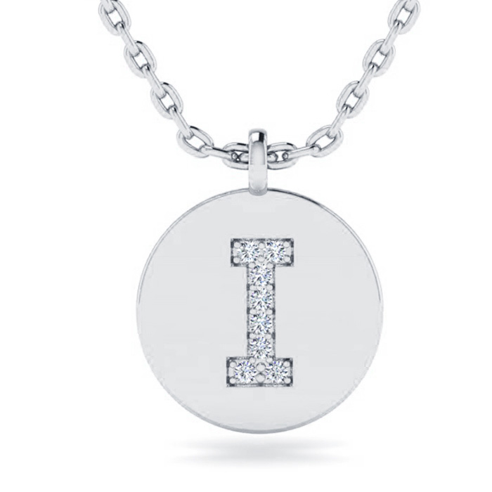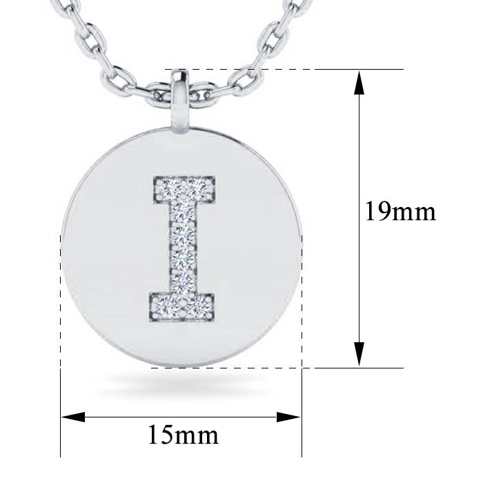 This classic initial necklace features 8-18 diamonds depending on the letter. The diamonds are in H-I color, I1-I2 clarity. The circle measures approximately 1/2 inch. This necklace comes with a 14 karat white gold cable chain with a lobster-claw clasp.