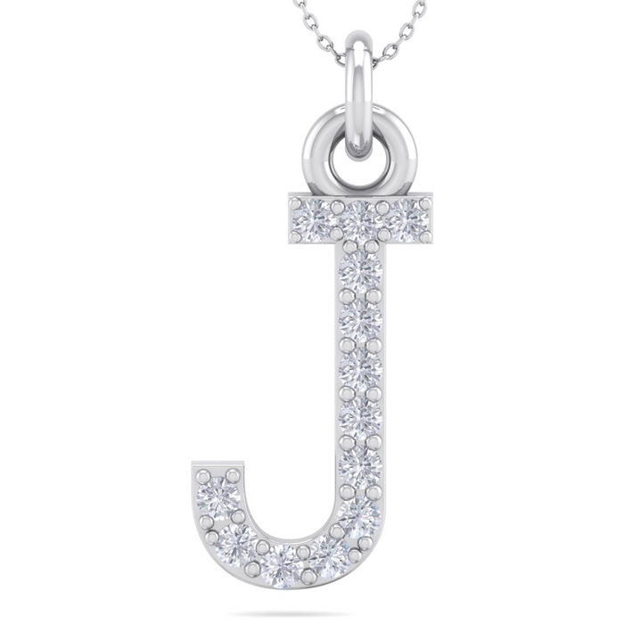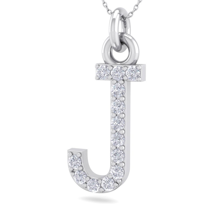 This classic J initial necklace features 13 diamonds in H-I color, I1-I2 clarity. Total carat weight is approximately 1/10 carat. The pendant measures just under 1/2 inch. This necklace is in 14 karat white gold and comes with an 18 inch cable chain with a spring ring clasp.