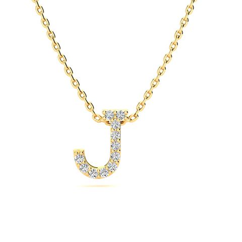 J Initial Necklace In 14K Yellow Gold With 11 Diamonds. The most popular block initial style, suspended from and 18 inch Yellow gold cable-rope chain with spring ring clasp. Fiery H-I color, I1-I2 diamonds.