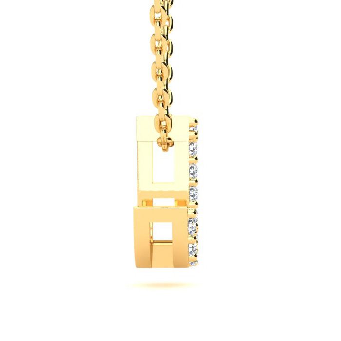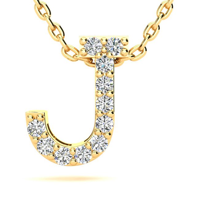J Initial Necklace In 14K Yellow Gold With 11 Diamonds. The most popular block initial style, suspended from and 18 inch Yellow gold cable-rope chain with spring ring clasp. Fiery H-I color, I1-I2 diamonds.