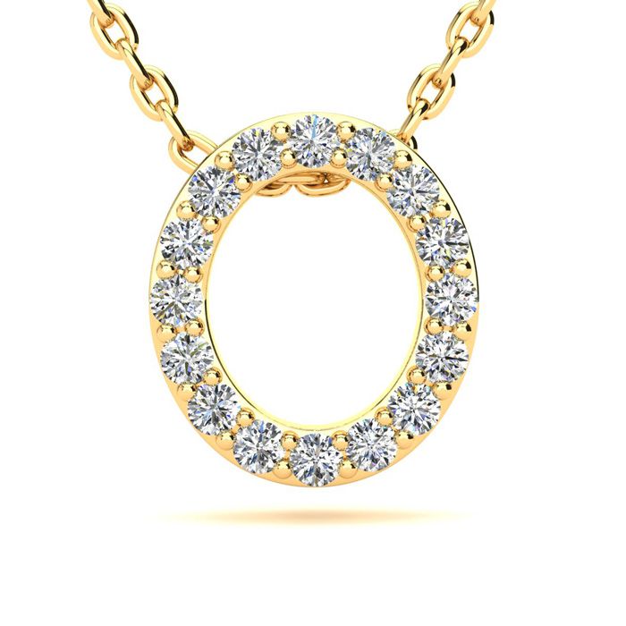 O Initial Necklace In 14K Yellow Gold With 16 Diamonds. The most popular block initial style, suspended from and 18 inch Yellow gold cable-rope chain with spring ring clasp. Fiery H-I color, I1-I2 diamonds.