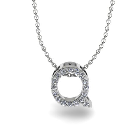 Q Initial Necklace In 14K White Gold With 17 Diamonds. The most popular block initial style, suspended from and 18 inch white gold cable-rope chain with spring ring clasp. Fiery H-I color, I1-I2 diamonds.