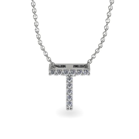 T Initial Necklace In 14K White Gold With 11 Diamonds. The most popular block initial style, suspended from and 18 inch white gold cable-rope chain with spring ring clasp. Fiery H-I color, I1-I2 diamonds.