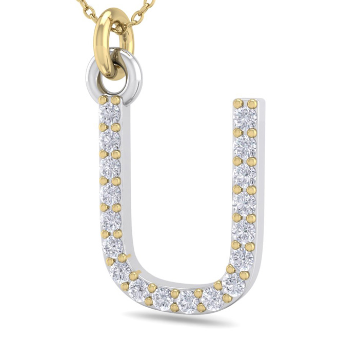 This classic U initial necklace features 18 diamonds in H-I color, I1-I2 clarity. Total carat weight is approximately 1/10 carat. The pendant measures just under 1/2 inch. This necklace is in 14 karat yellow gold and comes with an 18 inch cable chain with a spring ring clasp.