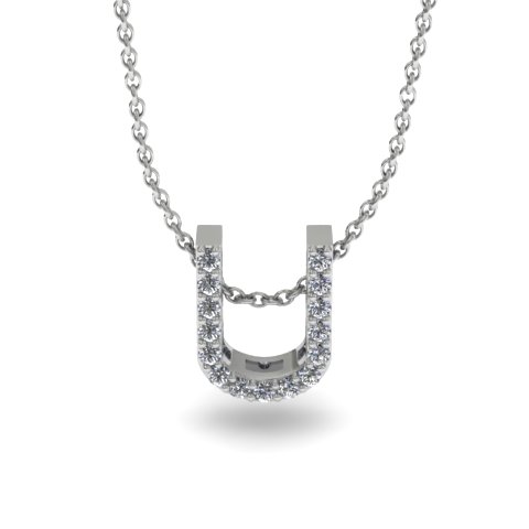 U Initial Necklace In 14K White Gold With 15 Diamonds. The most popular block initial style, suspended from and 18 inch white gold cable-rope chain with spring ring clasp. Fiery H-I color, I1-I2 diamonds.