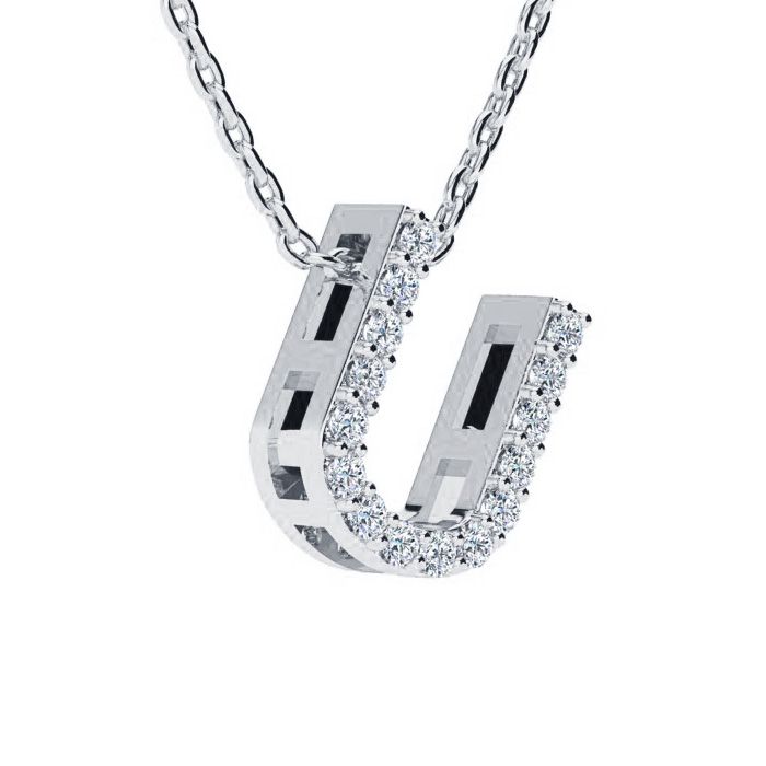 U Initial Necklace In 14K White Gold With 15 Diamonds. The most popular block initial style, suspended from and 18 inch white gold cable-rope chain with spring ring clasp. Fiery H-I color, I1-I2 diamonds.