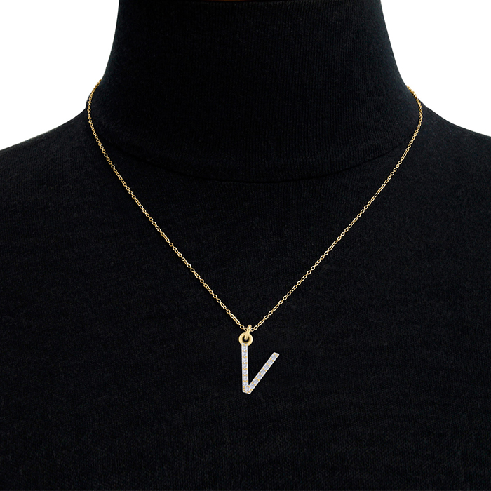 Letter V Diamond Initial Necklace In 14 Karat Yellow Gold With 15 Natural Diamonds