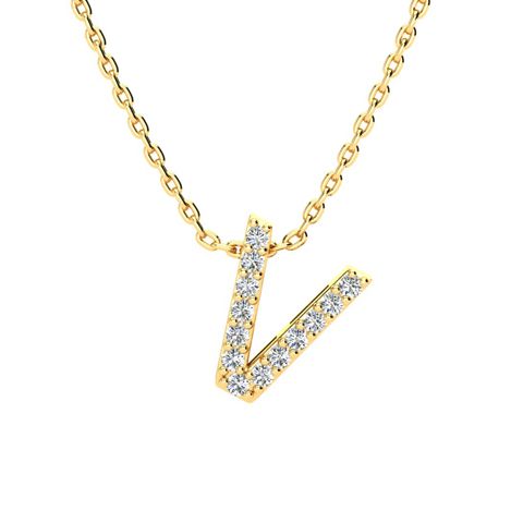 V Initial Necklace In 14K Yellow Gold With 13 Diamonds. The most popular block initial style, suspended from and 18 inch Yellow gold cable-rope chain with spring ring clasp. Fiery H-I color, I1-I2 diamonds.