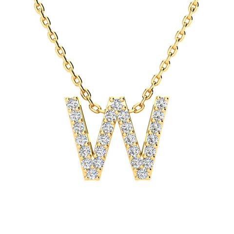 W Initial Necklace In 14K Yellow Gold With 25 Diamonds. The most popular block initial style, suspended from and 18 inch Yellow gold cable-rope chain with spring ring clasp. Fiery H-I color, I1-I2 diamonds.