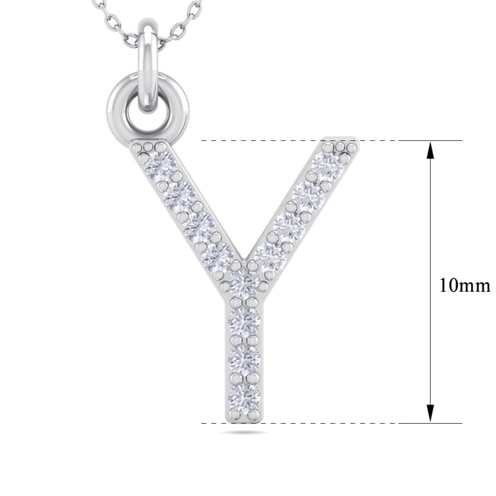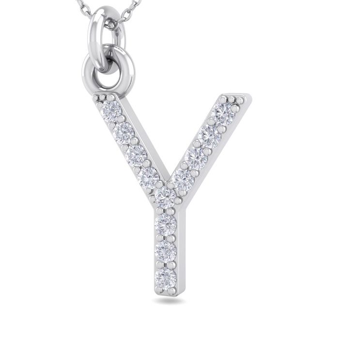 This classic Y initial necklace features 12 diamonds in H-I color, I1-I2 clarity. Total carat weight is approximately 1/10 carat. The pendant measures just under 1/2 inch. This necklace is in 14 karat white gold and comes with an 18 inch cable chain with a spring ring clasp.