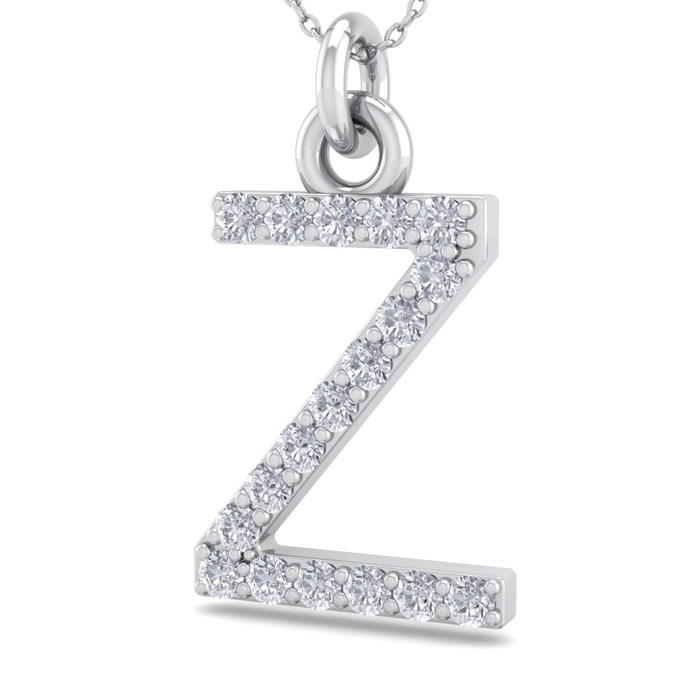 This classic Z initial necklace features 18 diamonds in H-I color, I1-I2 clarity. Total carat weight is approximately 1/10 carat. The pendant measures just under 1/2 inch. This necklace is in 14 karat white gold and comes with an 18 inch cable chain with a spring ring clasp.