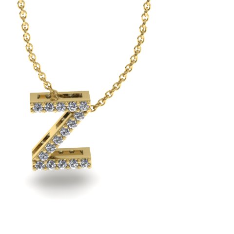 Z Initial Necklace In 14K Yellow Gold With 16 Diamonds. The most popular block initial style, suspended from and 18 inch Yellow gold cable-rope chain with spring ring clasp. Fiery H-I color, I1-I2 diamonds.
