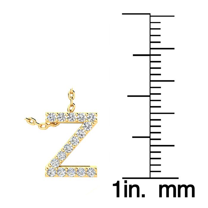 Z Initial Necklace In 14K Yellow Gold With 16 Diamonds. The most popular block initial style, suspended from and 18 inch Yellow gold cable-rope chain with spring ring clasp. Fiery H-I color, I1-I2 diamonds.