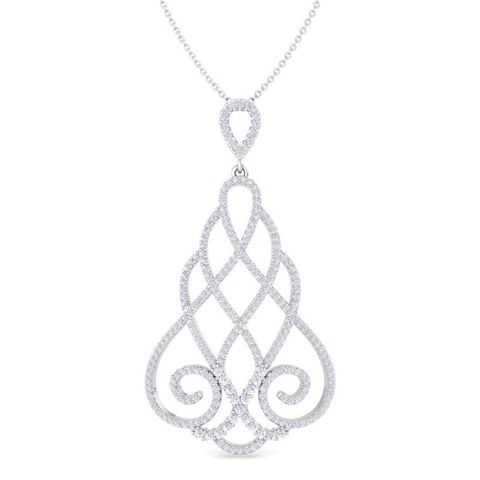 This fabulous diamond necklace features 245 sparkling diamonds in H-I color, SI2-I1 clarity. Total carat weight is 1 1/2 carats. This necklace is in 14 karat white gold and comes with an 18 inch cable chain with a spring-ring clasp. This chandelier pendant is 1 1/2 inches long.