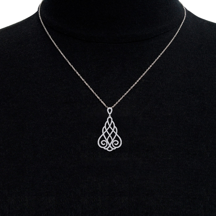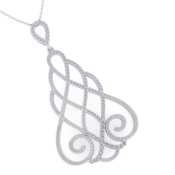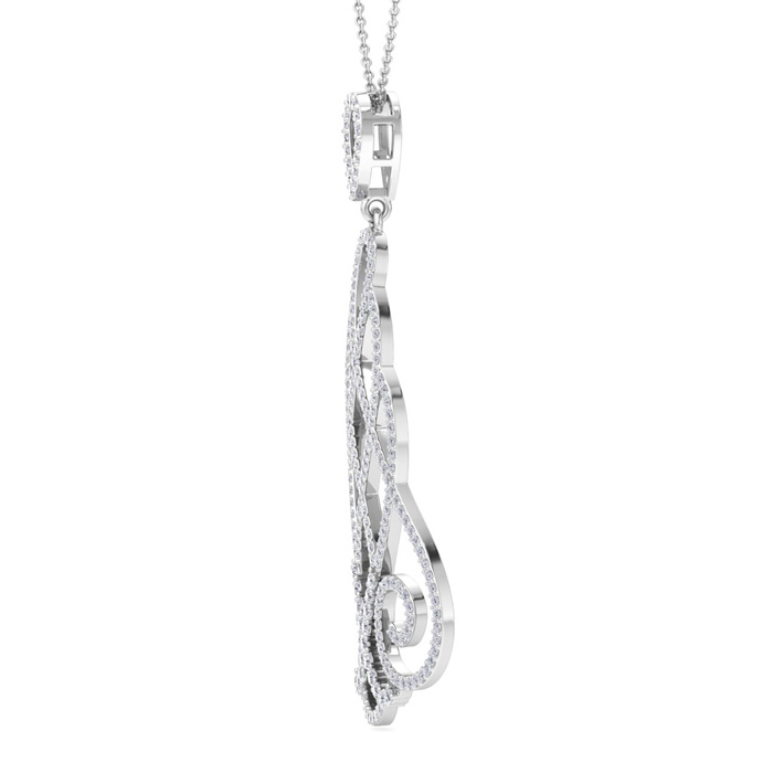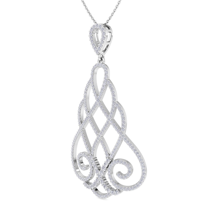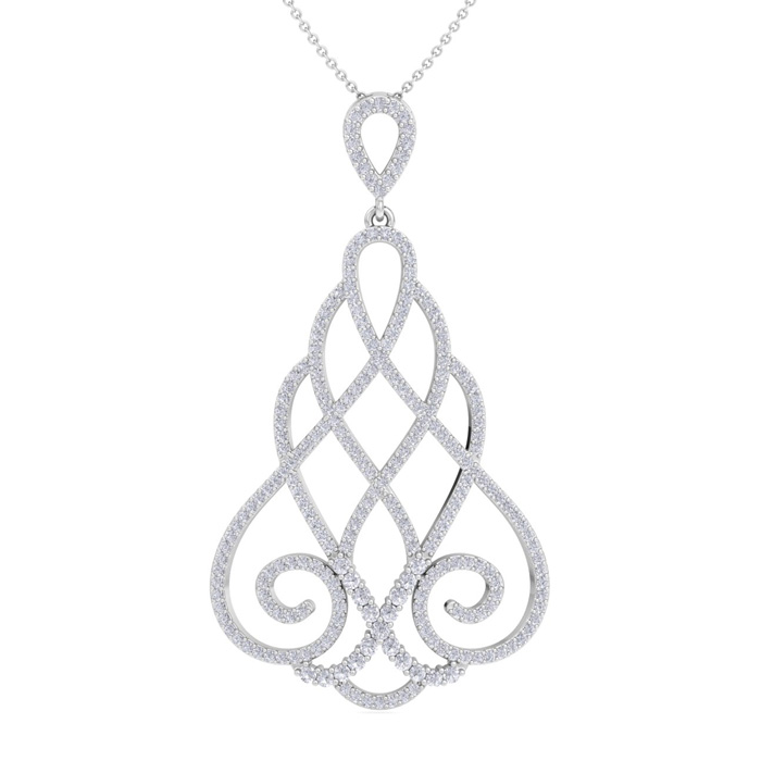 This fabulous diamond necklace features 245 sparkling diamonds in H-I color, SI2-I1 clarity. Total carat weight is 1 1/2 carats. This necklace is in 14 karat white gold and comes with an 18 inch cable chain with a spring-ring clasp. This chandelier pendant is 1 1/2 inches long.