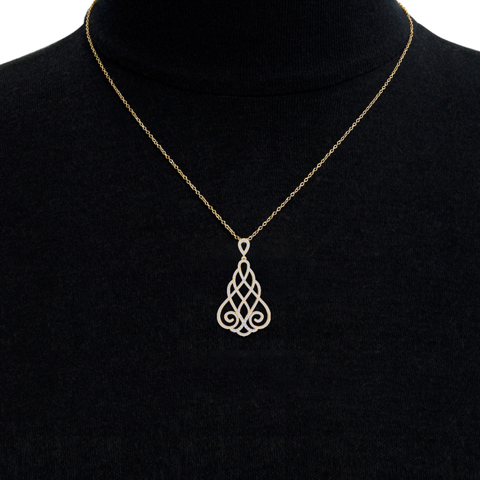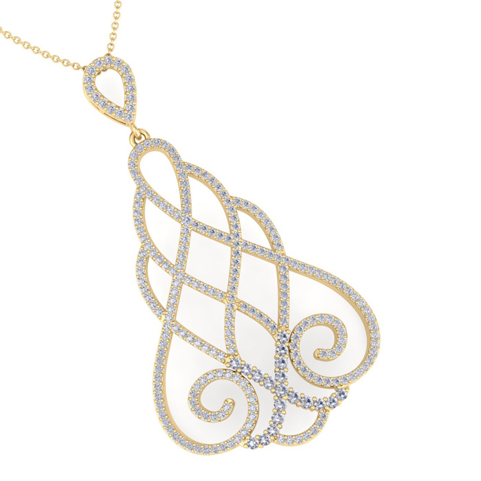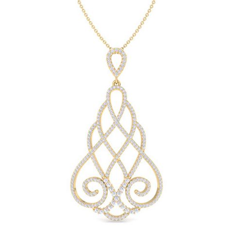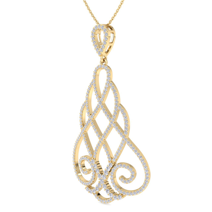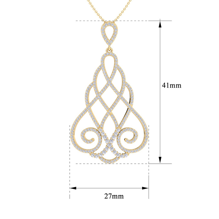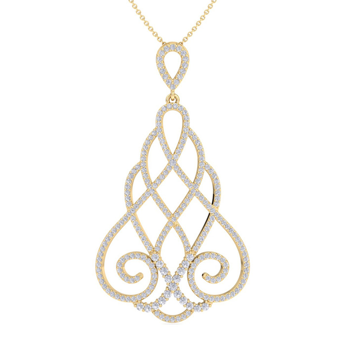 This fabulous diamond necklace features 245 sparkling diamonds in H-I color, SI2-I1 clarity. Total carat weight is 1 1/2 carats. This necklace is in 14 karat yellow gold and comes with an 18 inch cable chain with a spring-ring clasp. This chandelier pendant is 1 1/2 inches long.