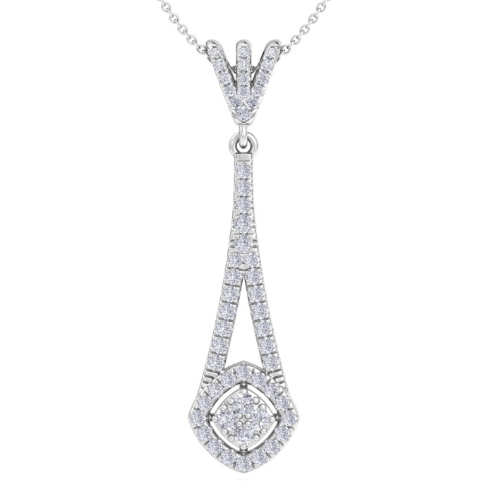 This fabulous diamond necklace features 54 sparkling diamonds in H-I color, SI2-I1 clarity. Total carat weight is 1/2 carat. This necklace is in 14 karat white gold and comes with an 18 inch cable chain with a spring-ring clasp. This chandelier pendant is 1 1/2 inches long.
