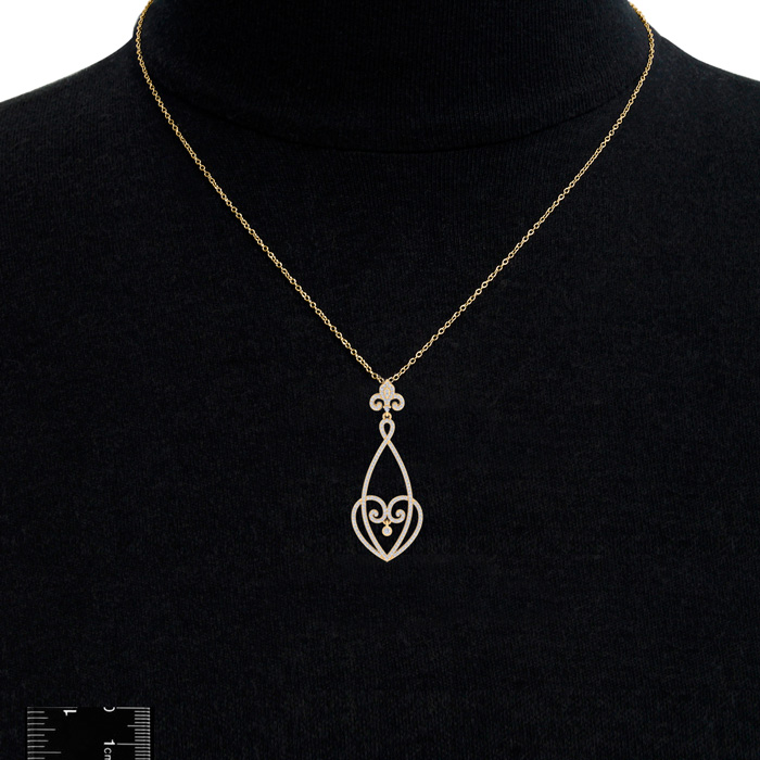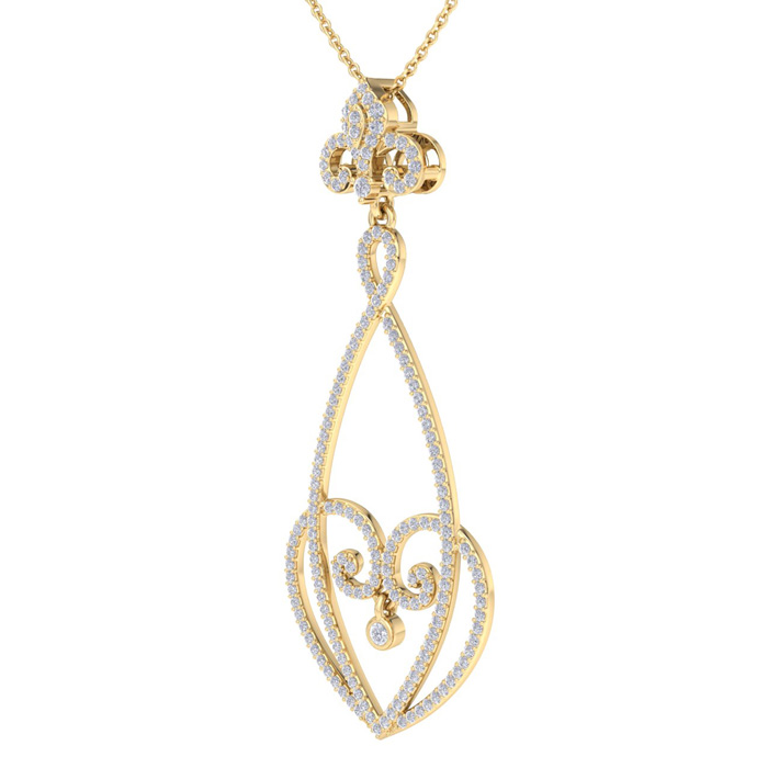 This fabulous diamond necklace features 180 sparkling diamonds in H-I color, SI2-I1 clarity. Total carat weight is 1 carat. This necklace is in 14 karat yellow gold and comes with an 18 inch cable chain with a spring-ring clasp. This chandelier pendant is 2 inches long.