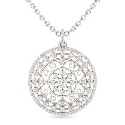 This fabulous diamond necklace features 104 sparkling diamonds in H-I color, SI2-I1 clarity. Total carat weight is 1 carat. This necklace is in 14 karat white gold and comes with an 18 inch cable chain with a spring-ring clasp. This circle pendant is 1 inch wide.