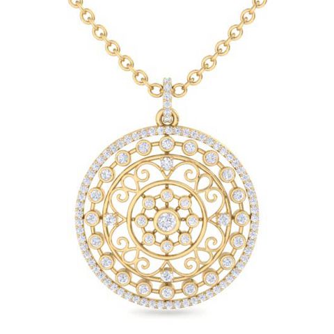 This fabulous diamond necklace features 104 sparkling diamonds in H-I color, SI2-I1 clarity. Total carat weight is 1 carat. This necklace is in 14 karat yellow gold and comes with an 18 inch cable chain with a spring-ring clasp. This circle pendant is 1 inch wide.
