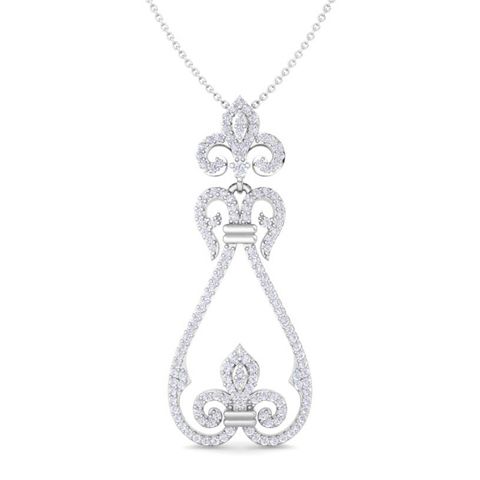 This fabulous diamond necklace features 143 sparkling diamonds in H-I color, SI2-I1 clarity. Total carat weight is 3/4 carat. This necklace is in 14 karat white gold and comes with an 18 inch cable chain with a spring-ring clasp. This chandelier pendant is 1 1/2 inches long.