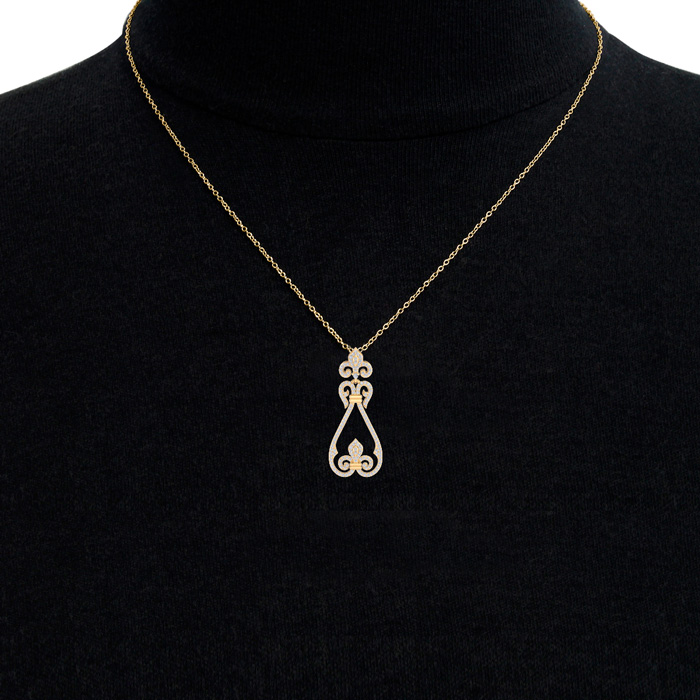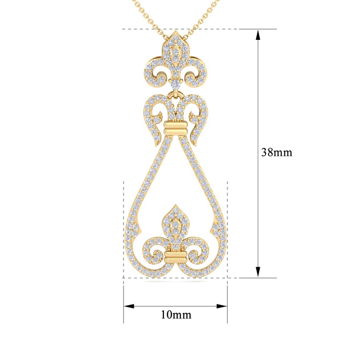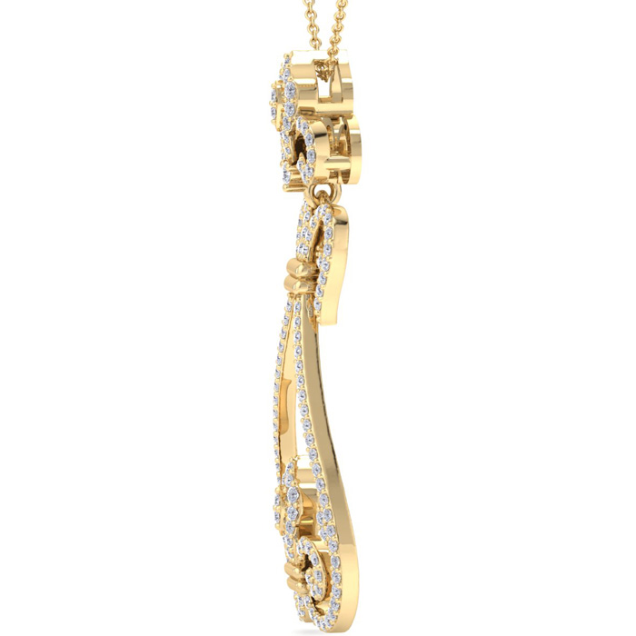 This fabulous diamond necklace features 143 sparkling diamonds in H-I color, SI2-I1 clarity. Total carat weight is 3/4 carat. This necklace is in 14 karat yellow gold and comes with an 18 inch cable chain with a spring-ring clasp. This chandelier pendant is 1 1/2 inches long.