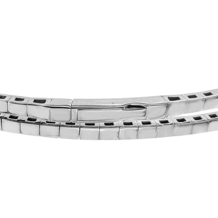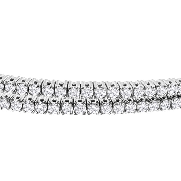 This amazing diamond tennis bangle bracelet features 110 sparkling diamonds in a double row. This bracelet is in 14 karat white gold and is 7 inches long with a box with tongue and safety clasp. Each strand is 2mm wide. This bangle bracelet is extremely flexible.