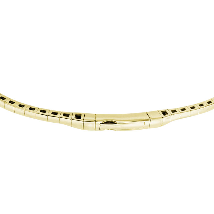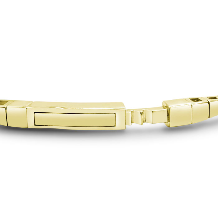This amazing diamond bangle bracelet features 113 sparkling diamonds in a double row. This bracelet is in 14 karat yellow gold and is 7 inches long with a box with tongue and safety clasp. This bracelet is 5mm wide. This bangle bracelet is extremely flexible.