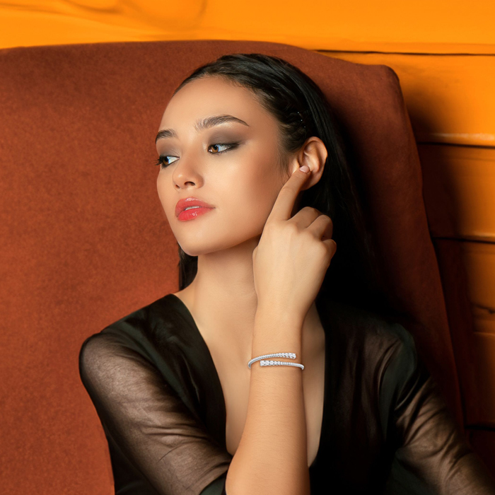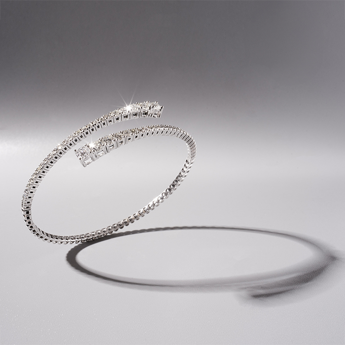 This flexible diamond bangle bracelet features 52 sparkling lab grown diamonds in G-H color, VS clarity. Total carat weight is 2 1/2 carats. This bracelet in 14 karat white gold. This bracelet fits a 7 inch wrist and has a secure, box clasp.